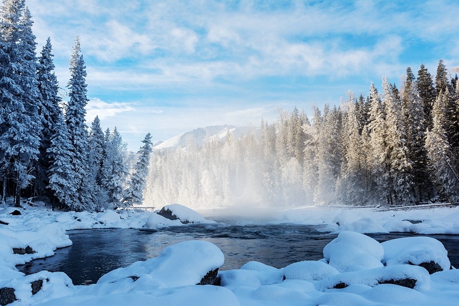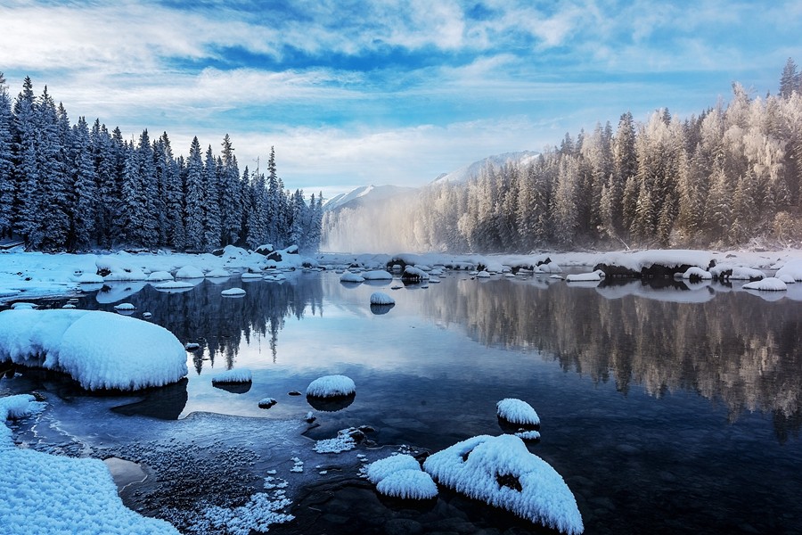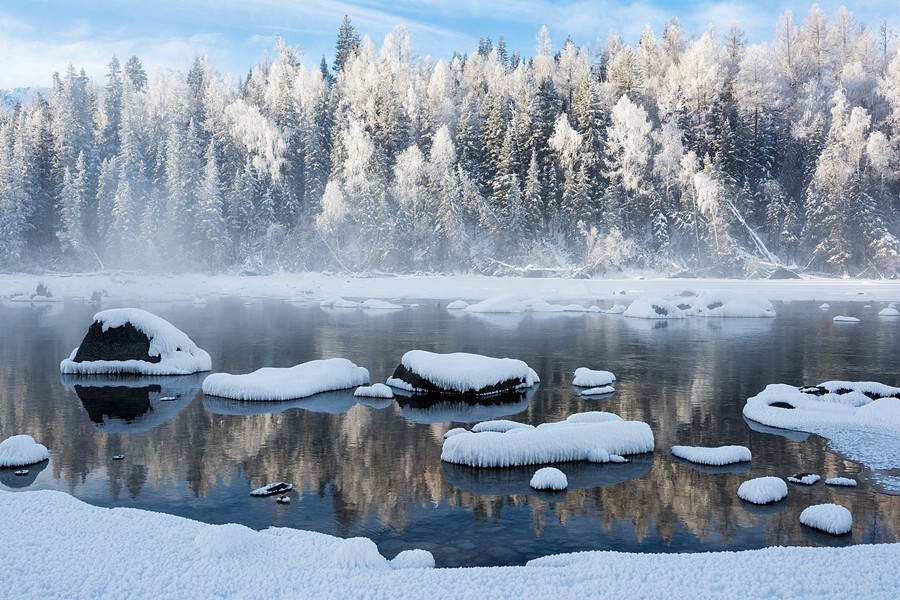 雪,是冬天最意蕴深远的留白,也是对春天最绵长的广告。冬日的喀纳斯,烟雾袅袅、群山静谧,在清白纯澈又安定的冬日时光中,喀纳斯化身为漂亮的使者,泛起出一片晶莹剔透的冰雪乐园,挂满枝头的雾凇在蓝天白云下,演出着奇异的风姿银枝招展,泛起出一片雪染的风范,让人怦然心动。(文家坡矿  董凤艳)